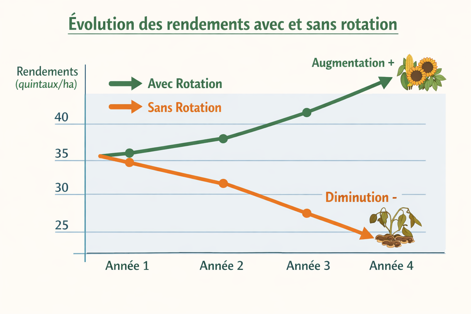 Imaginez que vous mangez le meme repas, tous les jours, pendant des annees. Un jour, votre corps sera epuise. Il manquera de vitamines, de mineraux, de force. Votre sante va baisser. La meme chose arrive a votre sol quand vous plantez la meme culture au meme endroit annee apres annee. Le sol se vide. Il s'epuise. Et vos recoltes baissent chaque annee un peu plus.