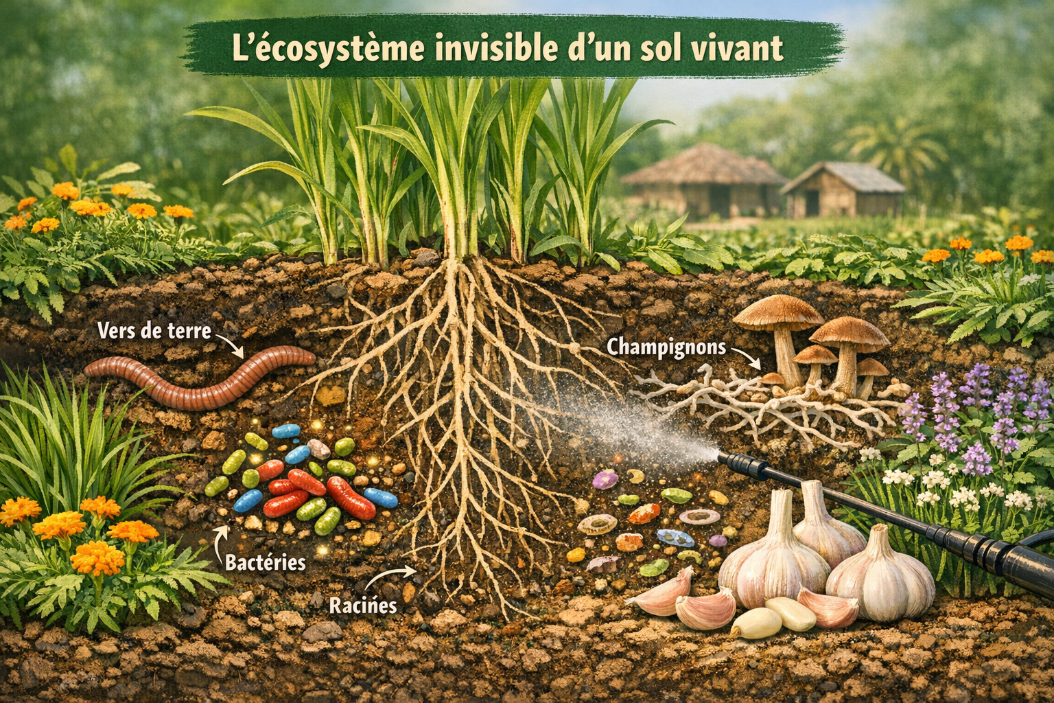 Un sol sain n'est pas du tout inerte. Selon les données de l'Organisation des Nations Unies pour l'alimentation et l'agriculture (FAO, 2020), un seul gramme de sol fertile contient entre 100 millions et 1 milliard de bactéries, des milliers d'espèces de champignons, des actinomycètes, des protozoaires, des nématodes utiles et de nombreux autres organismes invisibles à l'oeil nu. Si on pouvait peser toute la vie présente dans une hectare de sol sain, on obtiendrait entre 5 et 10 tonnes de biomasse vivante.
