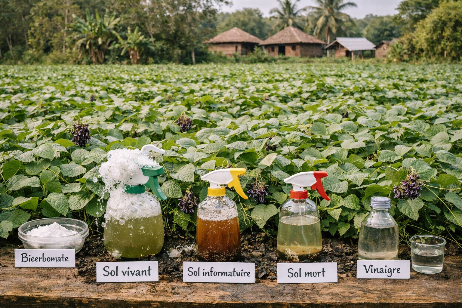 Ce troisieme test vous donne une indication rapide sur le pH de votre sol, sans pH-metre. Il utilise une reaction chimique simple entre le sol et deux substances : le vinaigre (acide) et le bicarbonate de soude (basique).